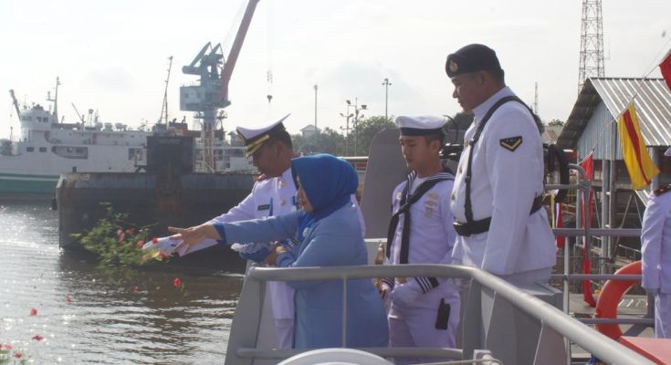 KOPPINEWS.ID,Pangkalpinang- Komandan Lanal Babel Kolonel Laut (P) Deni Indra M., S.Sos.,M. Tr. Hanla.,M.M. didampingi Ketua Cabang 4 Korcab lll DJA 1 Ny. Dian Deni Indra melaksanakan upacara tabur bunga dalam rangka memperingati hari Dharma Samudra tahun 2023, bertempat di geladak KRI Karotang-872 yang sandar di pelabuhan PT. Timah Pangkalbalam kota Pangkalpinang. (Senin,16 Januari 2023)