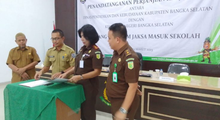 “Kepala dinas pendidikan dan kebudayaan Bangka Selatan (Basel) Elfan Rulyadi mengatakan, Alhamdulillah pada hari ini kami telah menandatangani MOU bersama dengan Kejari Bangka Selatan terkait kejaksaan masuk sekolah .