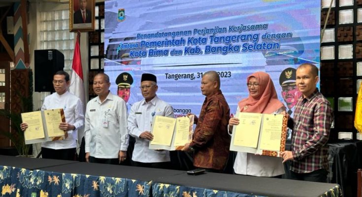 KOPPINEWS.ID,Tanggerang – Kepala Badan Kepegawaian dan Pengembangan Sumber Daya Manusia Daerah Kabupaten Bangka Selatan Suprayitno, S.Ag bersama Plt. Kepala Dinas Komunikasi dan Informatika Kabupaten Bangka Selatan Yuri Siswanto, S.ST., M.M melakukan Penandatanganan Perjanjian Kerjasama Penyerahan Software Aplikasi Kepegawaian dari Pemerintah Kota Tangerang ke Pemerintah Kabupaten Bangka Selatan di Kantor Walikota Tangerang, Rabu (31/5/23).