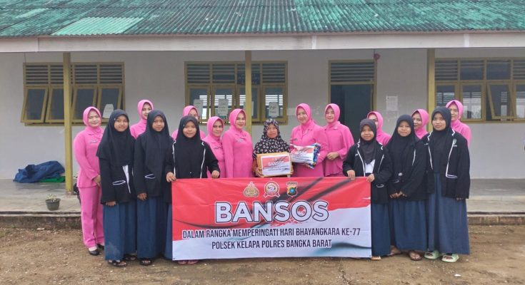 KOPPINEWS.ID,BABAR- Dalam rangka memperingati HUT Bhayangkara yang ke-77, berbagai kegiatan bakti sosial dan bantuan sosial diadakan di Masjid Sirotholmustaqim, Gereja Gekisia PT.BPL, dan Pondok Pesantren Darul Ulum An-Naml di Kecamatan Kelapa, Kabupaten Bangka Barat. Kegiatan ini diorganisir oleh Personel Polsek Kelapa dan Bhayangkari Ranting Kelapa dengan tujuan memberikan kontribusi positif kepada masyarakat sekitar.kamis 8 Juni 2023