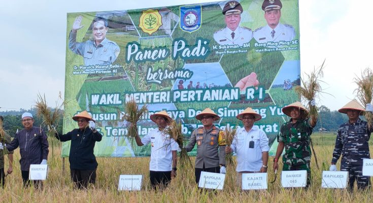 Kunjungan tersebut berlangsung di Desa Sp Yul, Kecamatan Tempilang, dengan tema “Panen Padi Bersama dan Peninjauan Pembibitan Komoditas Unggulan Kabupaten Bangka Barat”.