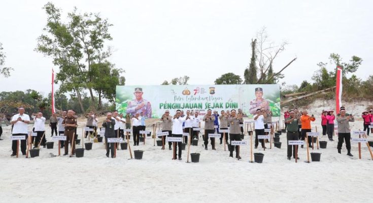KOPPINEWS.ID, PANGKALPINANG – Rabu (23/08/2023) Sebanyak 10.000 bibit pohon ditanam secara serentak di seluruh Kabupaten dan Kota di Provinsi Kepulauan Bangka Belitung (Kep. Babel). Kegiatan ini pun juga dilakukan di seluruh Indonesia oleh anggota Kepolisian Republik Indonesia (Polri). Atas inisiatif program yang positif ini, Penjabat (Pj) Gubernur Kep. Babel Suganda Pandapotan Pasaribu memberikan apresiasi kegiatan Penanaman Pohon “Polri Lestarikan Negeri, Penghijauan Sejak dini” di Lahan Bekas Tambang Timah, Sebelah BLK Provinsi Kep. Babel.
