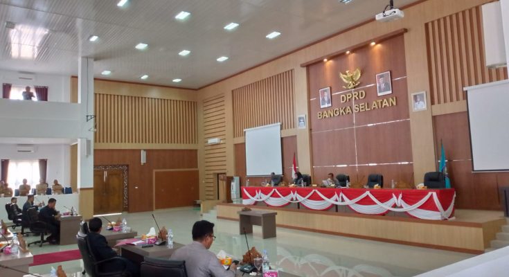 BANGKA SELATAN, KOPPINEWS.ID – Rapat Paripurna DPRD Kabupaten Bangka Selatan dalam rangka Penyampaian Raperda tentang Pajak Daerah dan Retribusi Daerah, Rencana Tata Ruang Wilayah Tahun 2023-2043. Kemudian, Rapat Paripurna Pengambilan Keputusan Raperda tentang Tata Cara Penyelenggaraan Cadangan Pangan, Penanggulangan Penyakit Menular, Penetapan Hari Jadi Kota Toboali, Penyelenggaraan Ketertiban Umum dan Ketentraman Masyarakat serta Perlindungan Masyarakat. Di Ruang Paripurna Junjung Besaoh DPRD Kab. Bangka Selatan (Basel), Kepulauan Bangka Belitung (Babel) Senin (11/9/2023).
