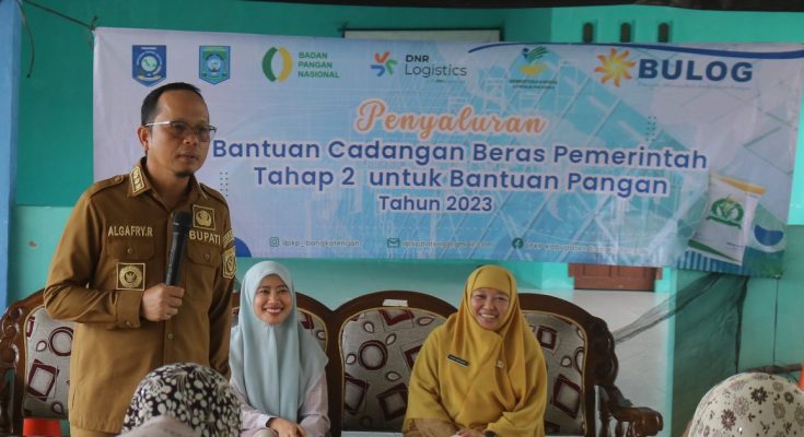 Bupati Bangka Tengah, Algafry Rahman didampingi Eva Algafry selaku Ketua TP-PKK Kabupaten Bangka Tengah dan Dian Akbarini selaku Kepala Dinas Pertanian dan Ketahanan Pangan Bateng menyerahkan secara langsung Cadangan Pangan Pemerintah kepada masyarakat.