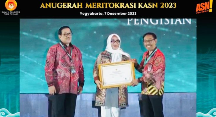 Penghargaan yang diberikan Ketua KASN, Agus Pramusinto di Yogyakarta, Kamis (7/12/2023) hari ini diterima langsung oleh Penjabat (Pj) Wali Kota Pangkalpinang, Lusje Anneke Tabalujan.
